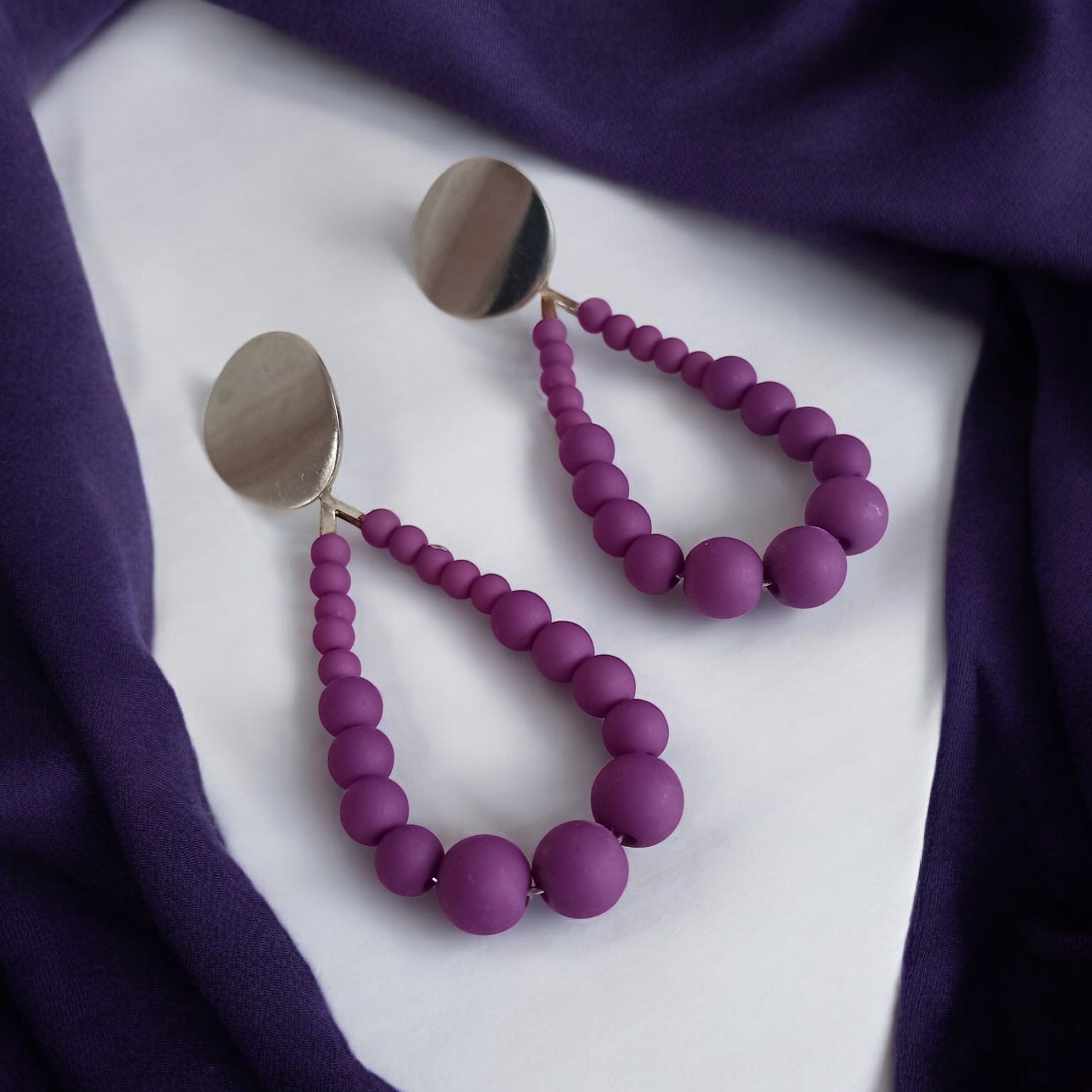 Les apprêts sont en clous argentés de 18mm en métal TQ, les perles sont en acryliques mat de tailles 4mm/6mm/8mm de couleur violet.