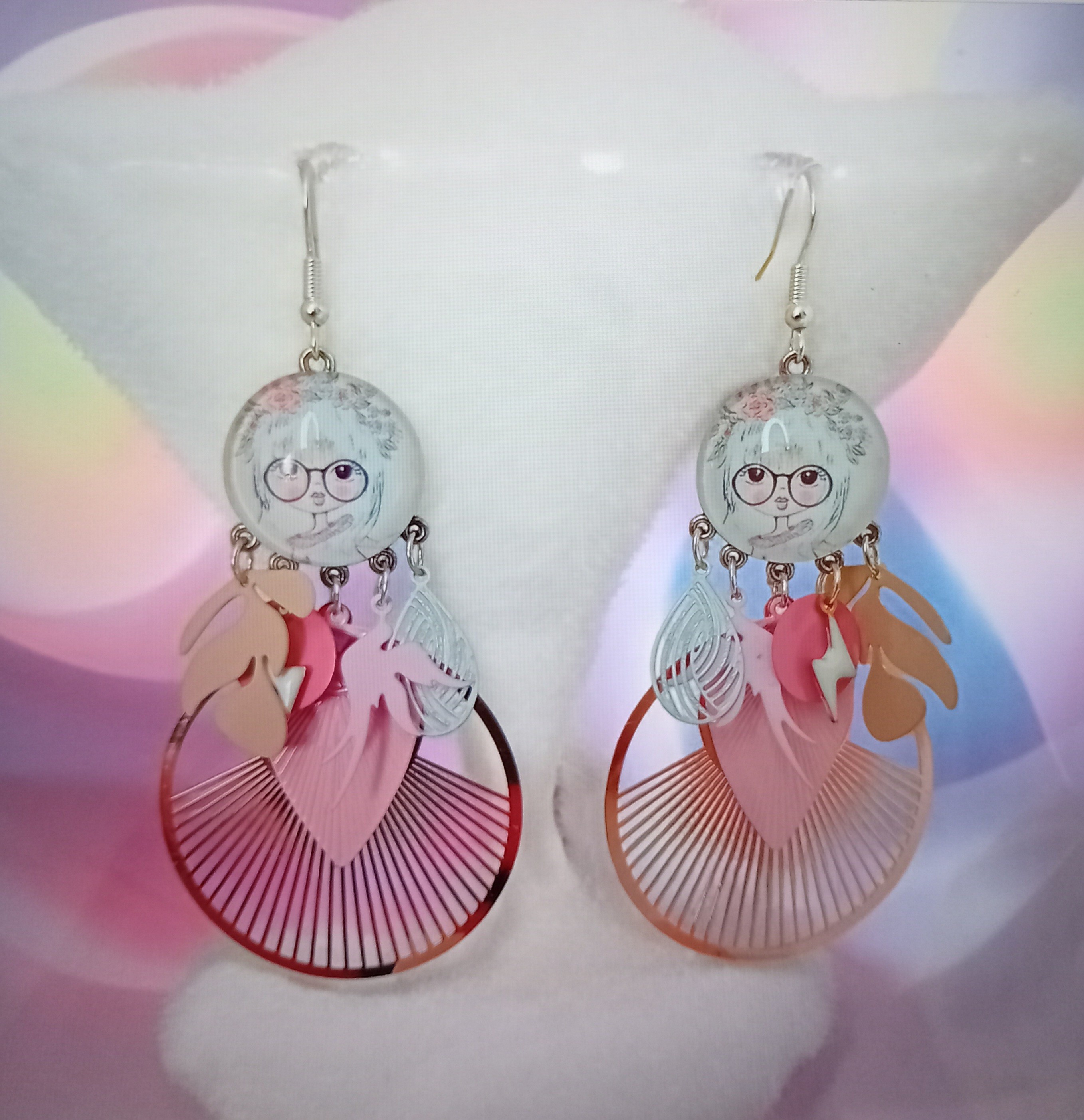 L'estampe rose gold apporte une élégance subtile à ces boucles d'oreilles, tandis que les estampes de formes variées dans les tons doux ajoutent une touche de délicatesse. Chaque boucle d'oreille est ornée d'un cabochon en verre de 20 mm avec un motif jeune femme portant une couronne de fleurs sur la tête. Ce motif apporte une touche de féminité et de romantisme à ces boucles d'oreilles.