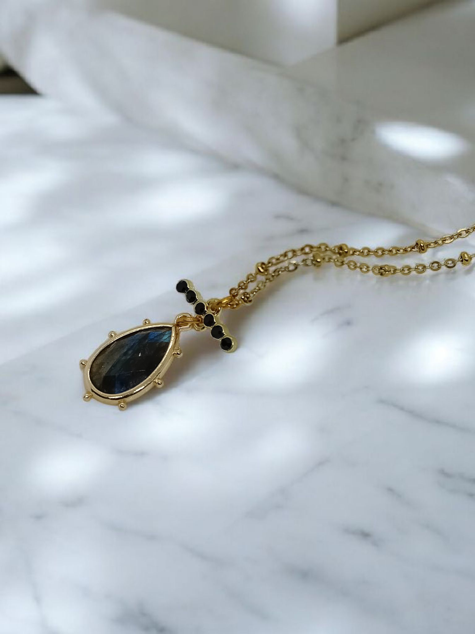 ✨ Ce collier à chaîne fine dorée met en valeur un pendentif imitation Labradorite, aux reflets profonds et mystérieux. Élégant et délicat, il apporte une touche subtile de caractère à vos tenues, qu'elles soient sobres ou plus habillés.