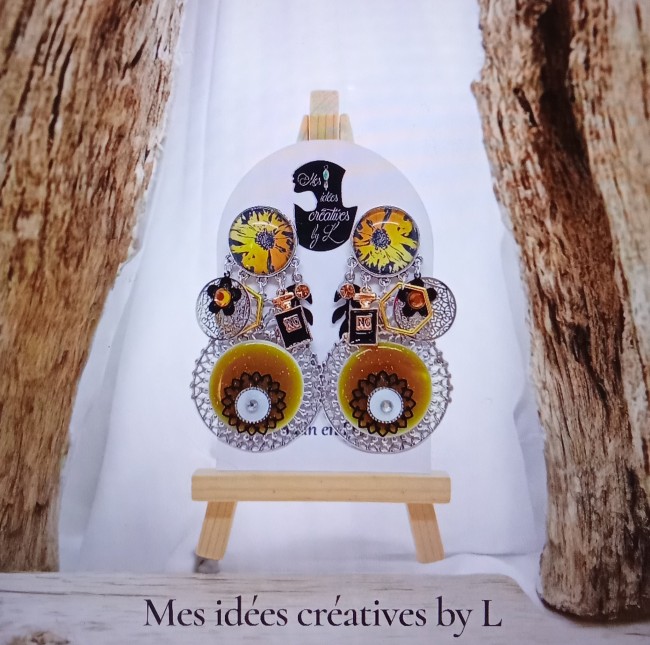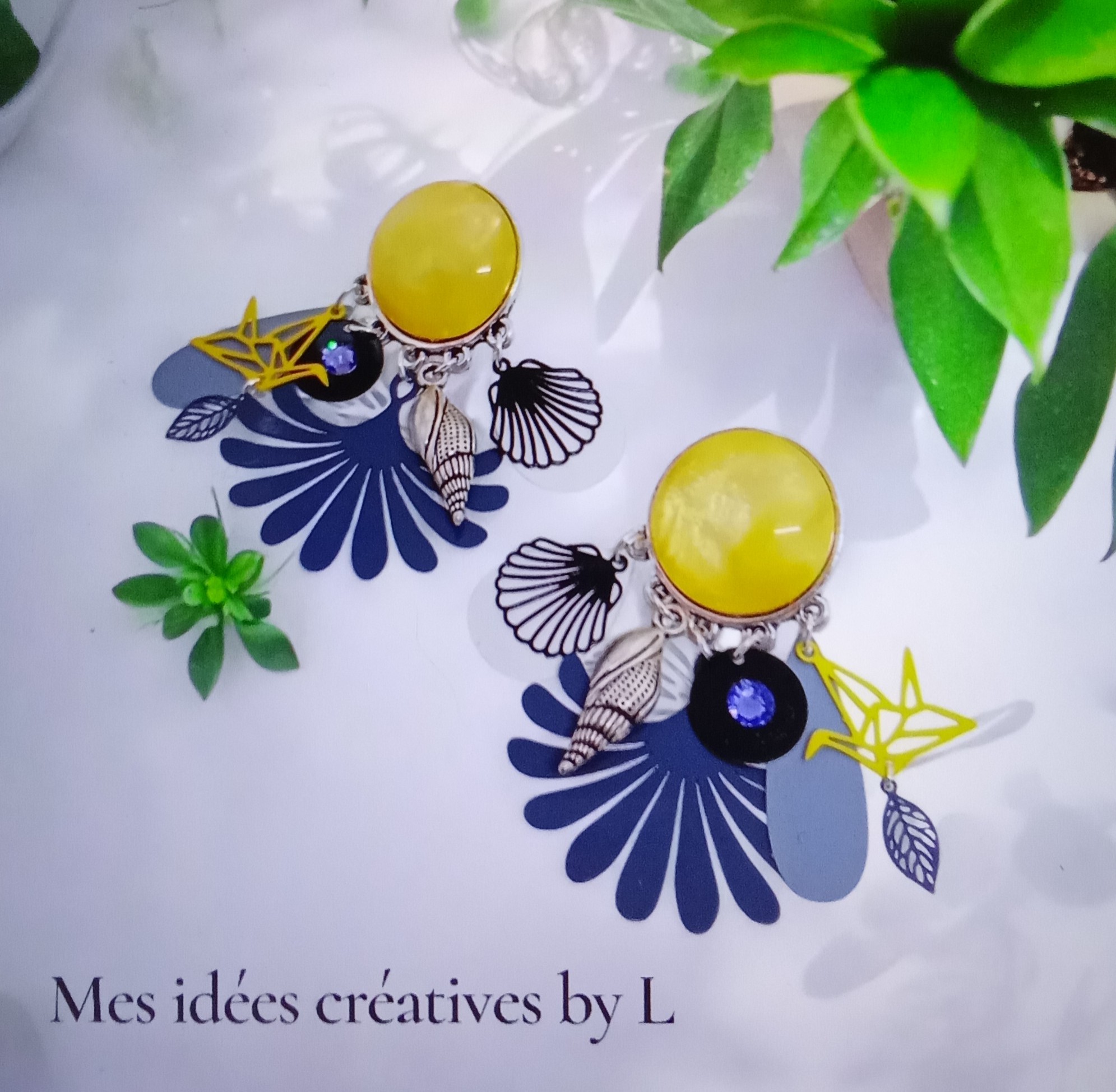 Le cabochon jaune apporte une touche de luminosité et de gaieté à ces boucles, tandis que l'estampe en forme d'eventail grise ajoute une note d'élégance. Les estampes de couleurs jaune, noir, gris et blanc créent un contraste harmonieux et captivant.