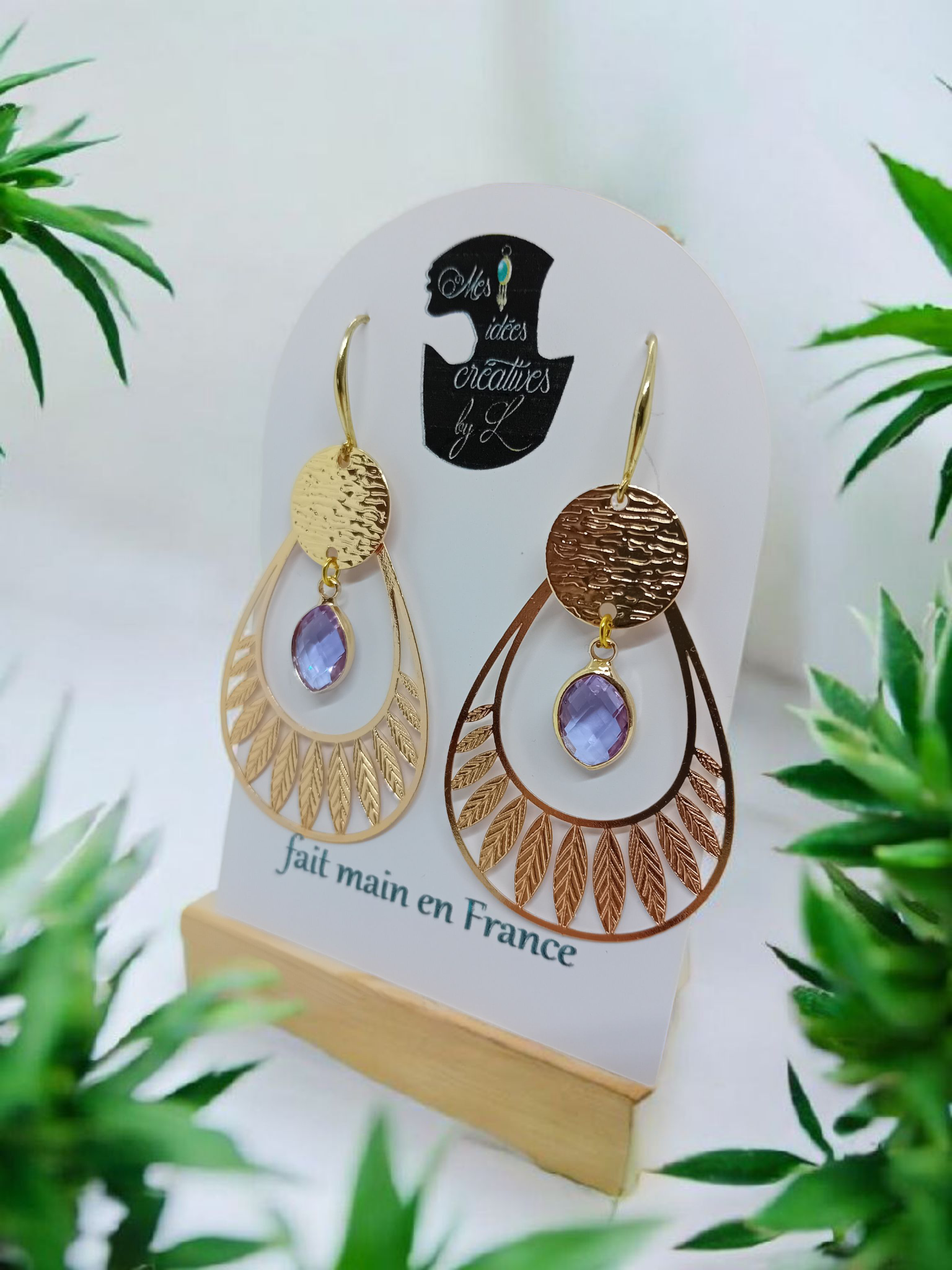 💫 Laissez-vous envoûter par les somptueuses boucle d'oreille Myla, véritables joyaux pour sublimer votre style. Ces boucles d'oreilles sont un mariage parfait entre l'élégance et la finesse. Elles sont composées d'un pendentif filigrané doré, d'un connecteur rond doré et d'un pendentif Marquise couleur parme transparent, qui captivera tous les regards.