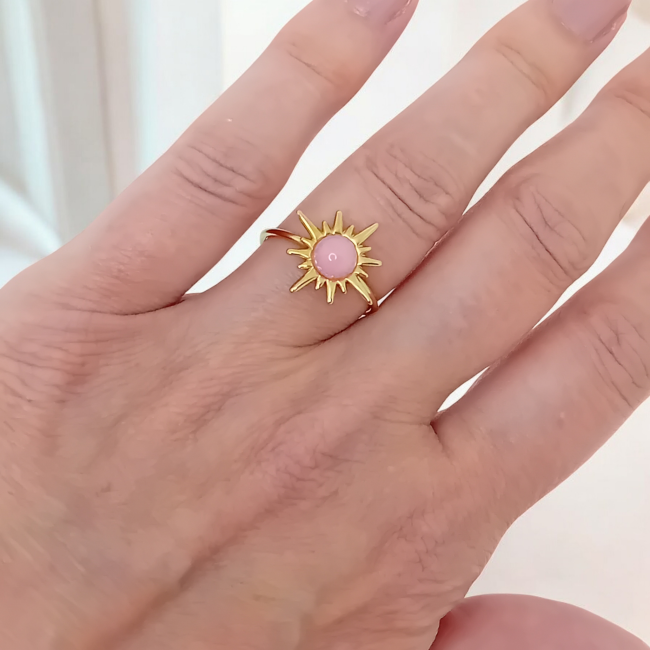 Bague dorée ajustable en forme de soleil, avec un petit cabochon rose.