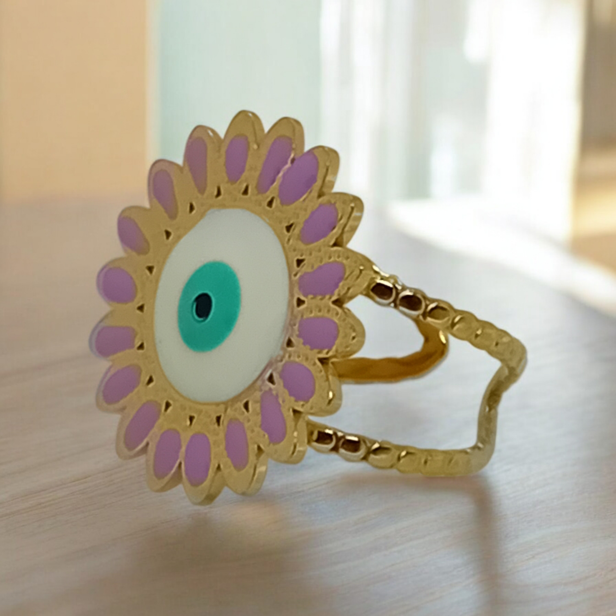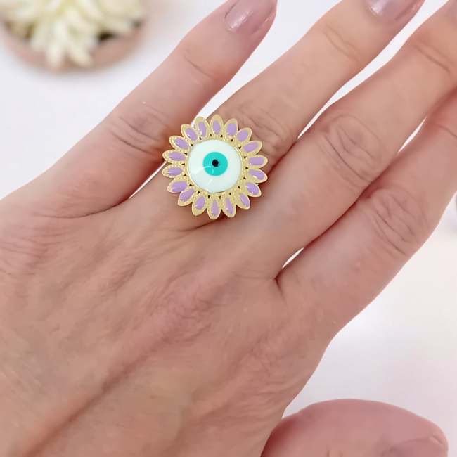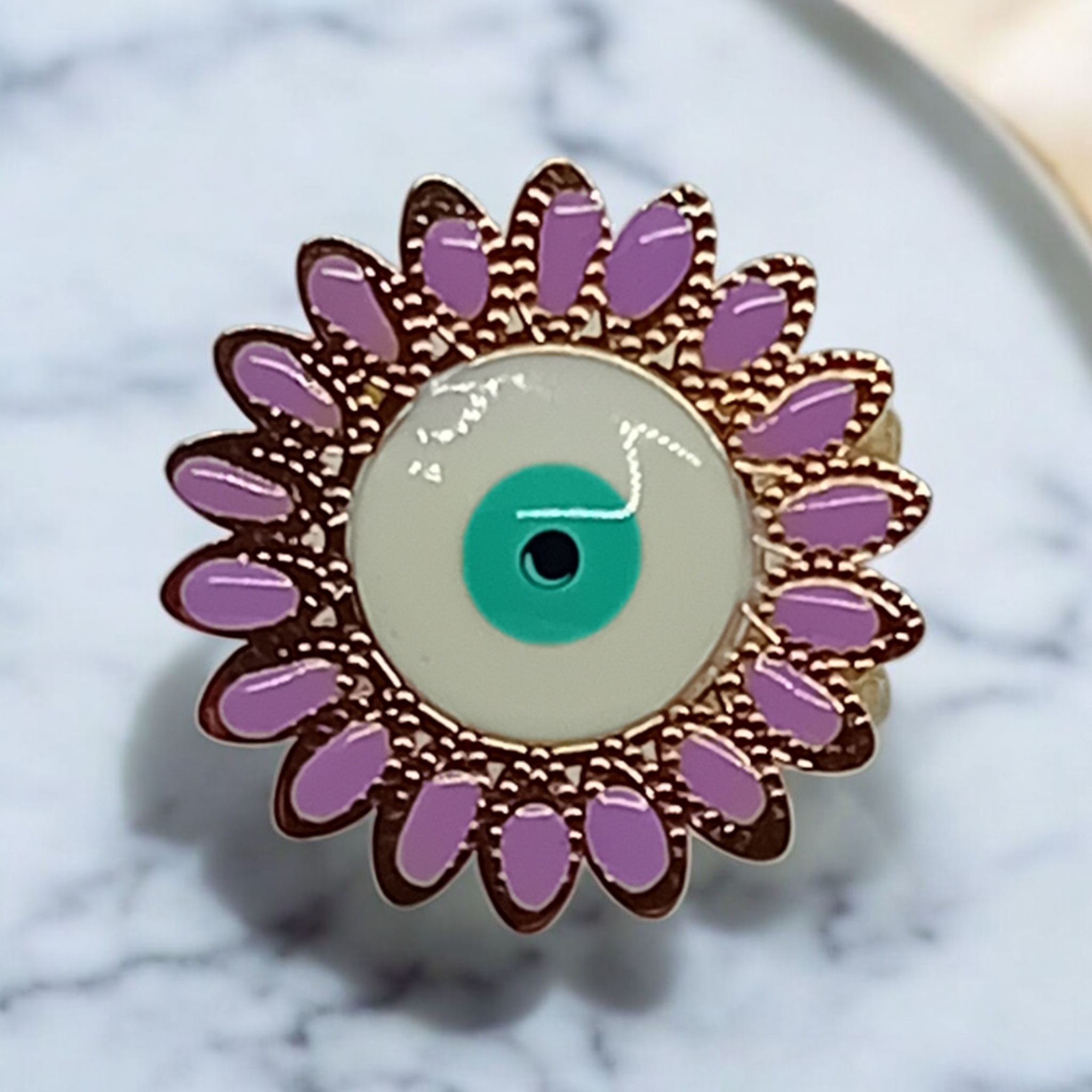 Bague ajustable en forme de fleur, dont les pétales sont de couleur lilas, orné d'un œil au milieu.