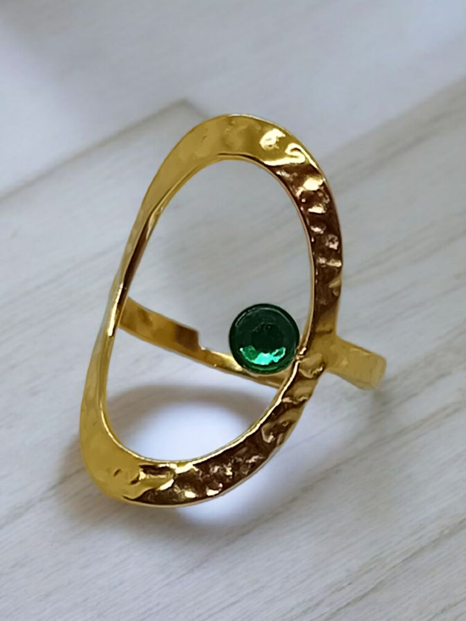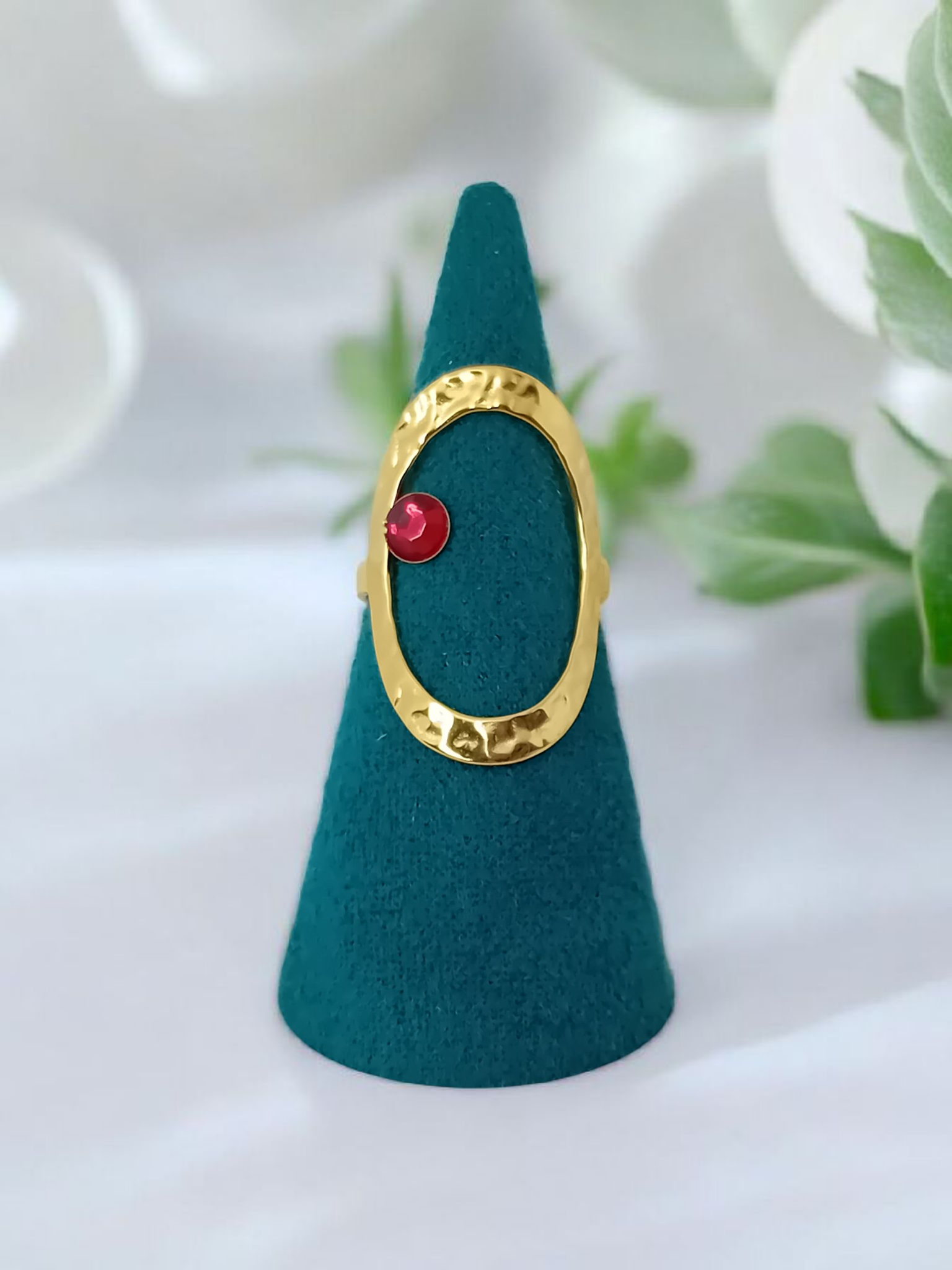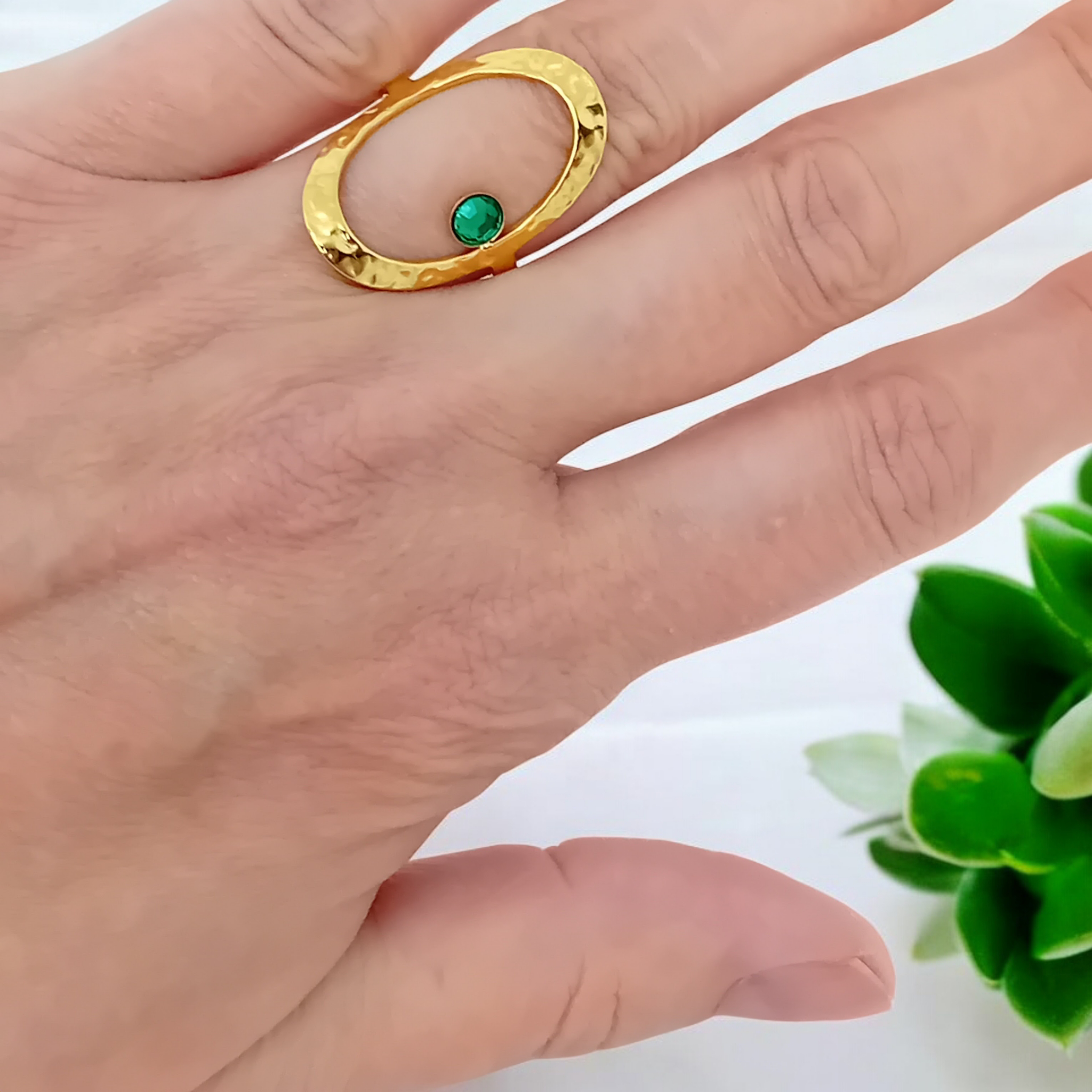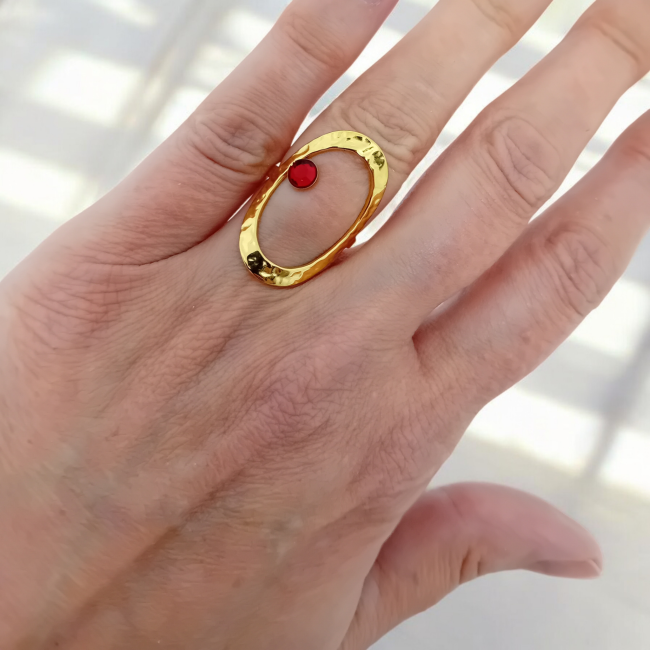 Magnifique bague couleur or ajustable et martelée de forme ovale, avec un strass vert ou rouge.