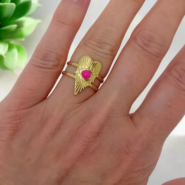 Bague couleur or, ajustable et texturée en forme de cœur allongé, avec un œil pour motif et un petit cabochon rose foncé.
