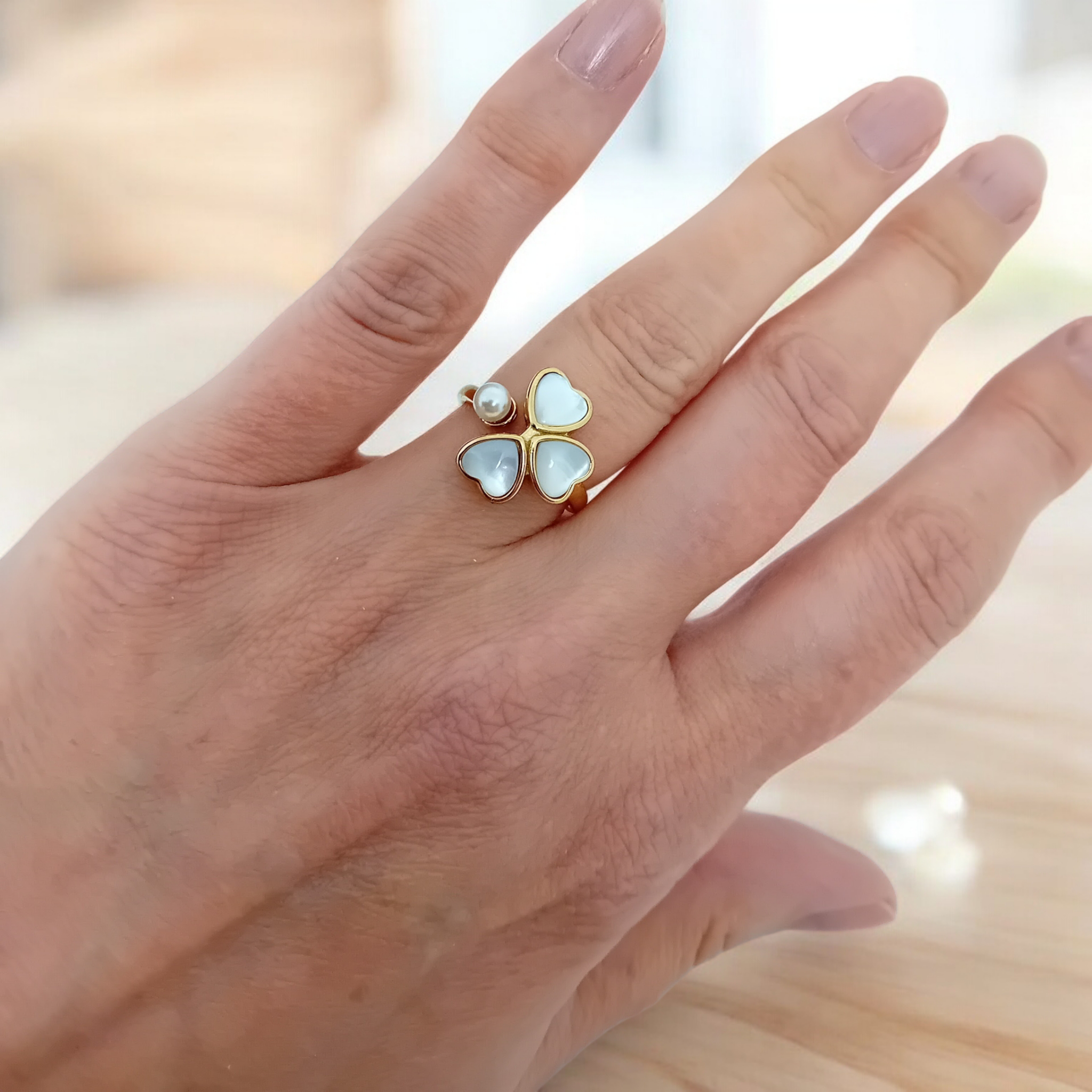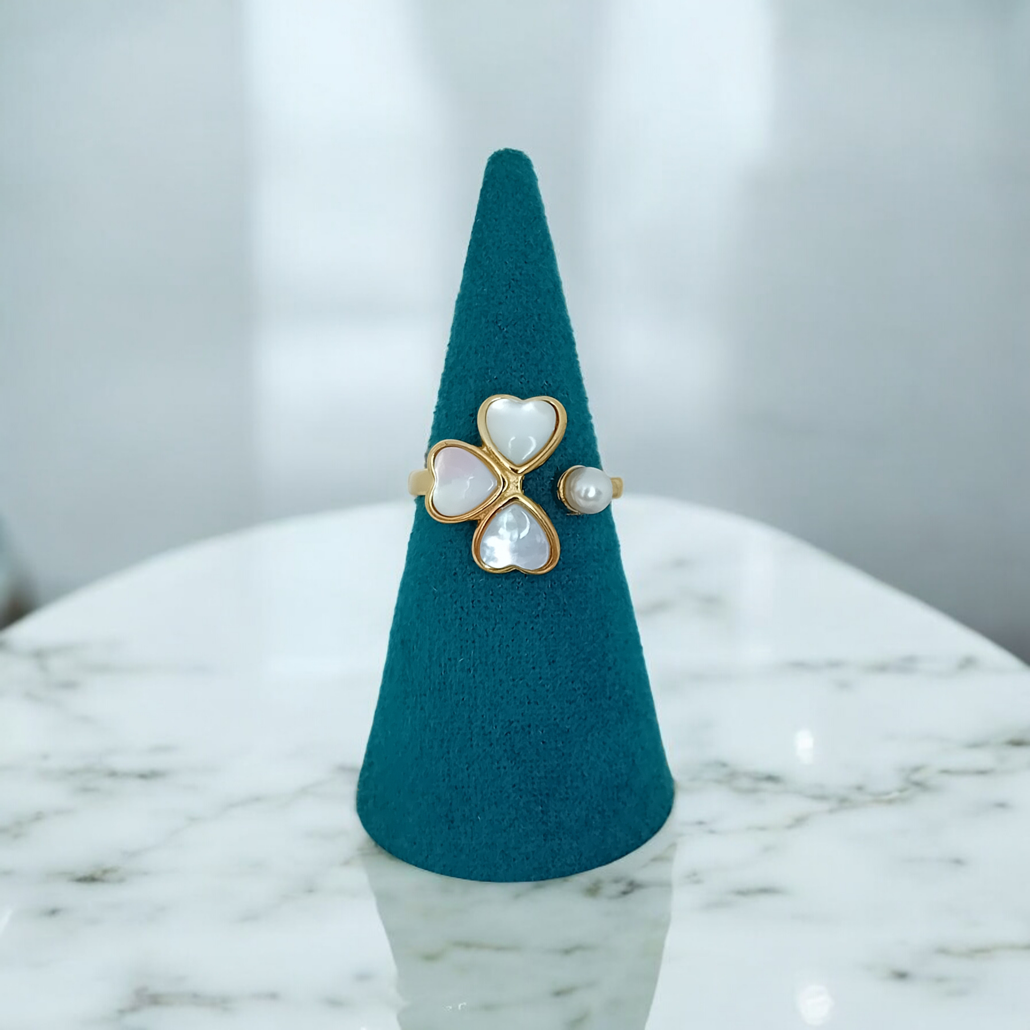 🌸 Cette bague délicate capture la douceur et la poésie des formes naturelles. Son motif évoque au choix une fleur à trois pétales ou un trèfle à trois feuilles, symbole de chance et de délicatesse. Les pétales sont habillés d'un blanc nacré, subtilement irisé, accompagnés d'une petite perle assortie qui apporte une touche de pureté.