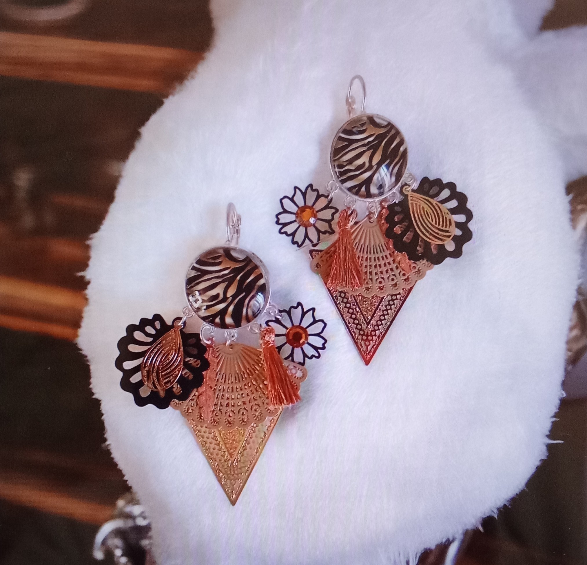 ✨ Ajoutez une touche de sophistication à votre look avec ces magnifiques boucles d'oreilles pendantes dans les couleurs noir, doré et marron.