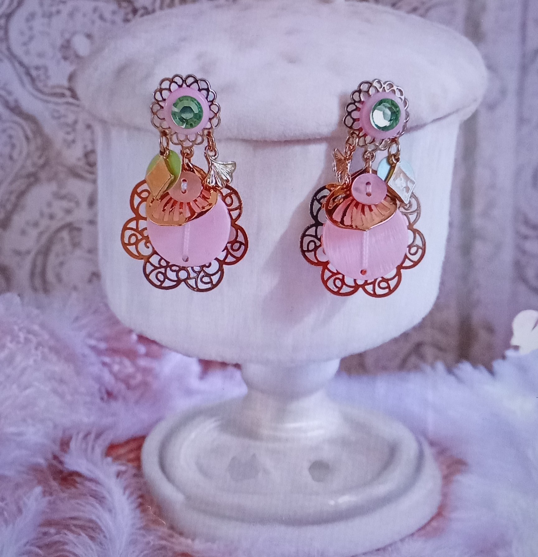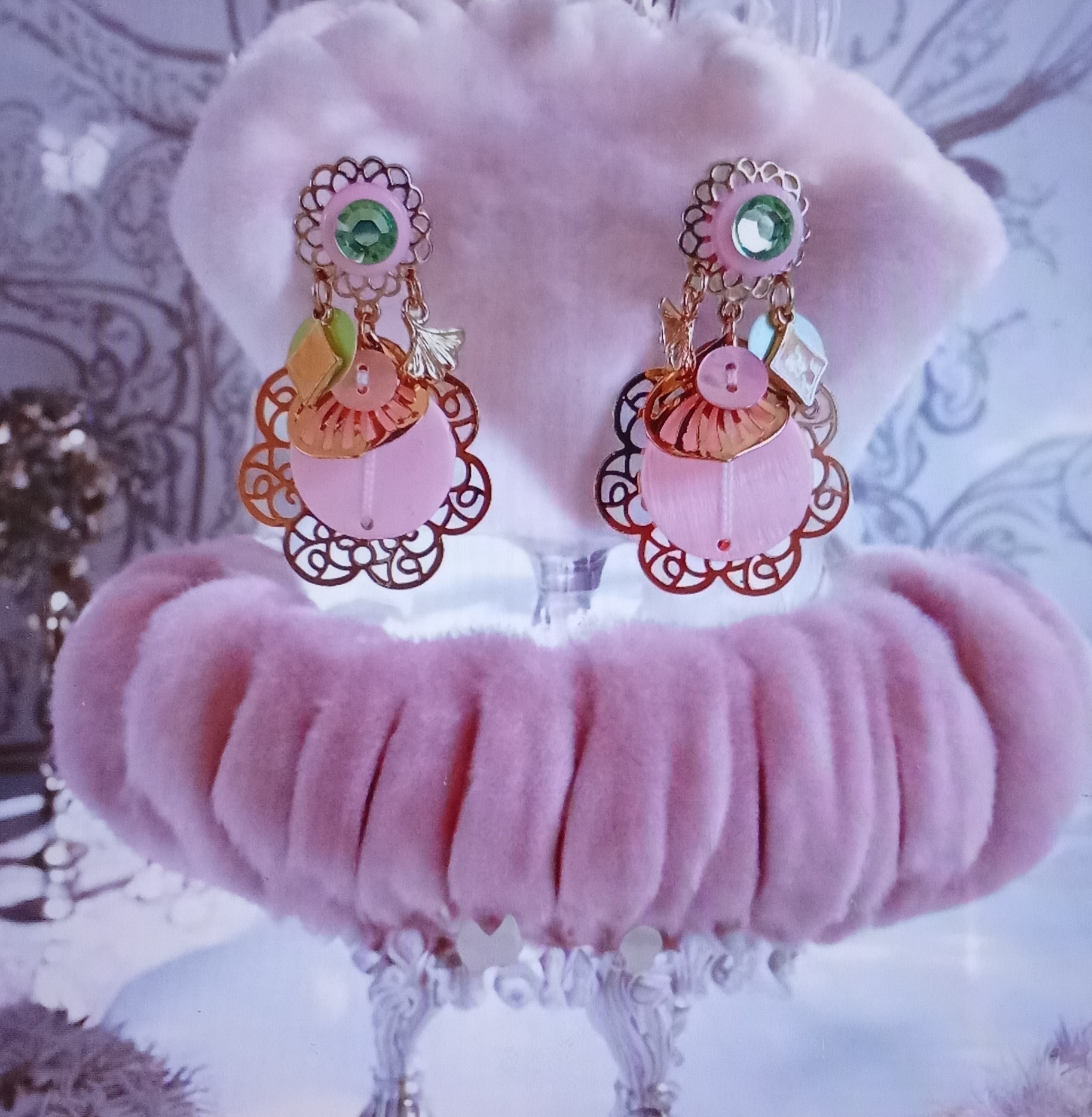 Boucles d'oreilles accompagnées d'estampes dorées, rose et vert.