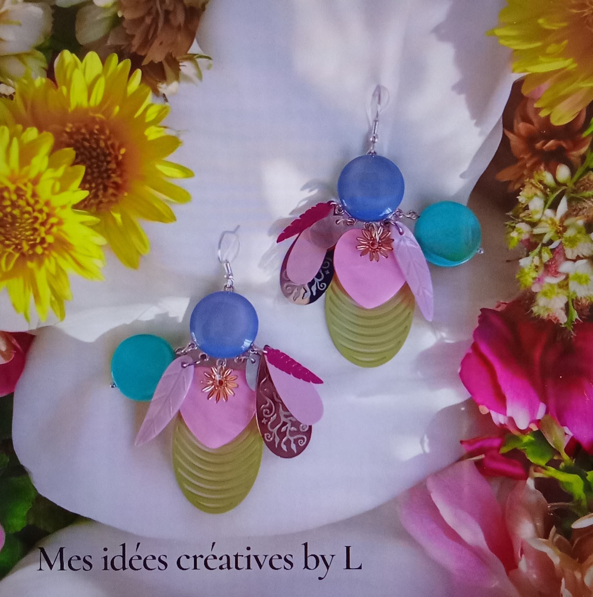 Cory : boucles d'oreilles avec divers estampes dans les tons : rose, bleu/turquoise et jaune, une petite fleur dorée accompagne les estampes.