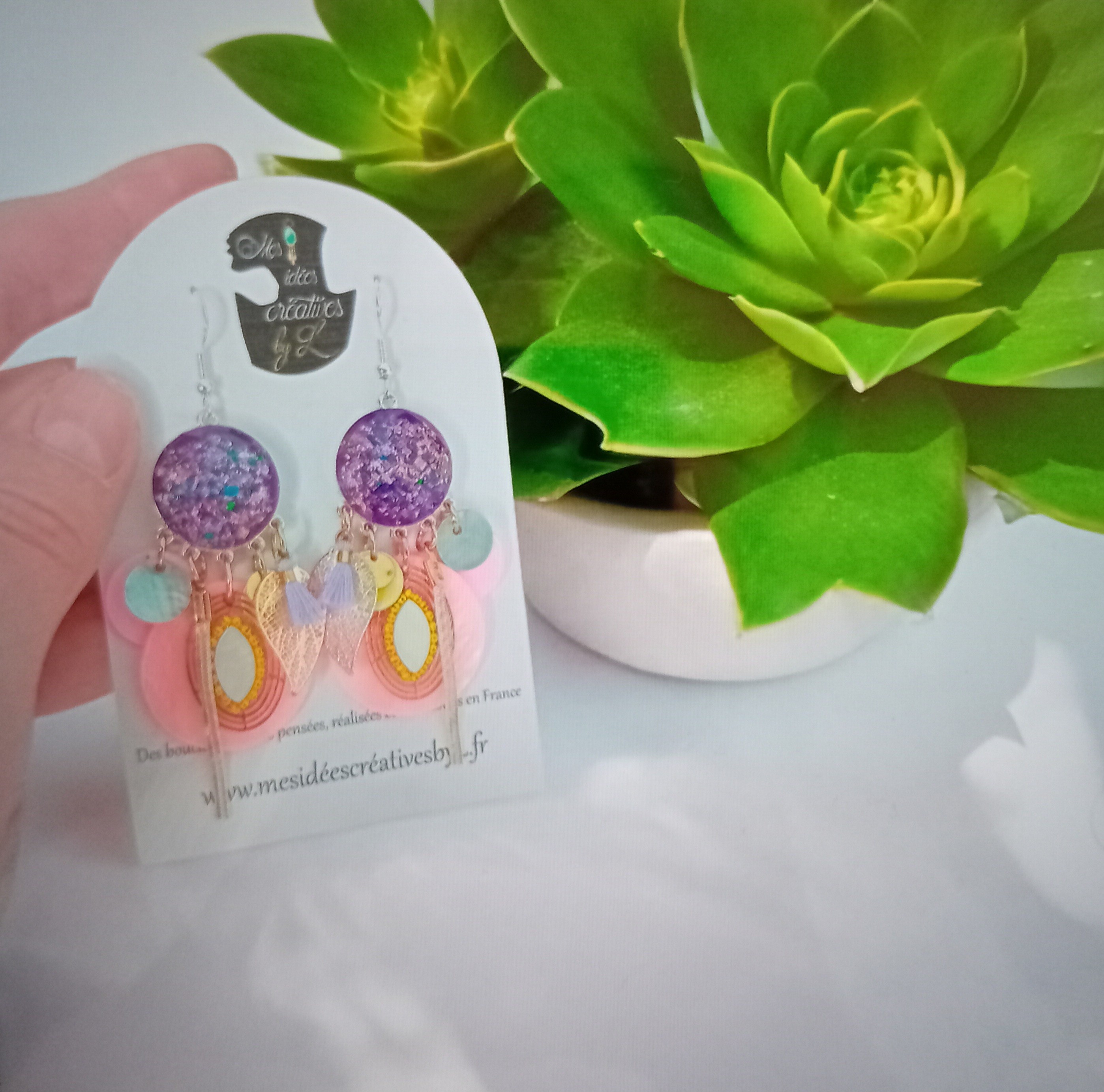 Découvrez ces magnifiques boucles d'oreilles pendantes scintillantes ✨, un véritable bijou pour sublimer votre style! Dotées d'un cabochon violet à effets paillettes, ces boucles d'oreilles captiveront tous les regards.