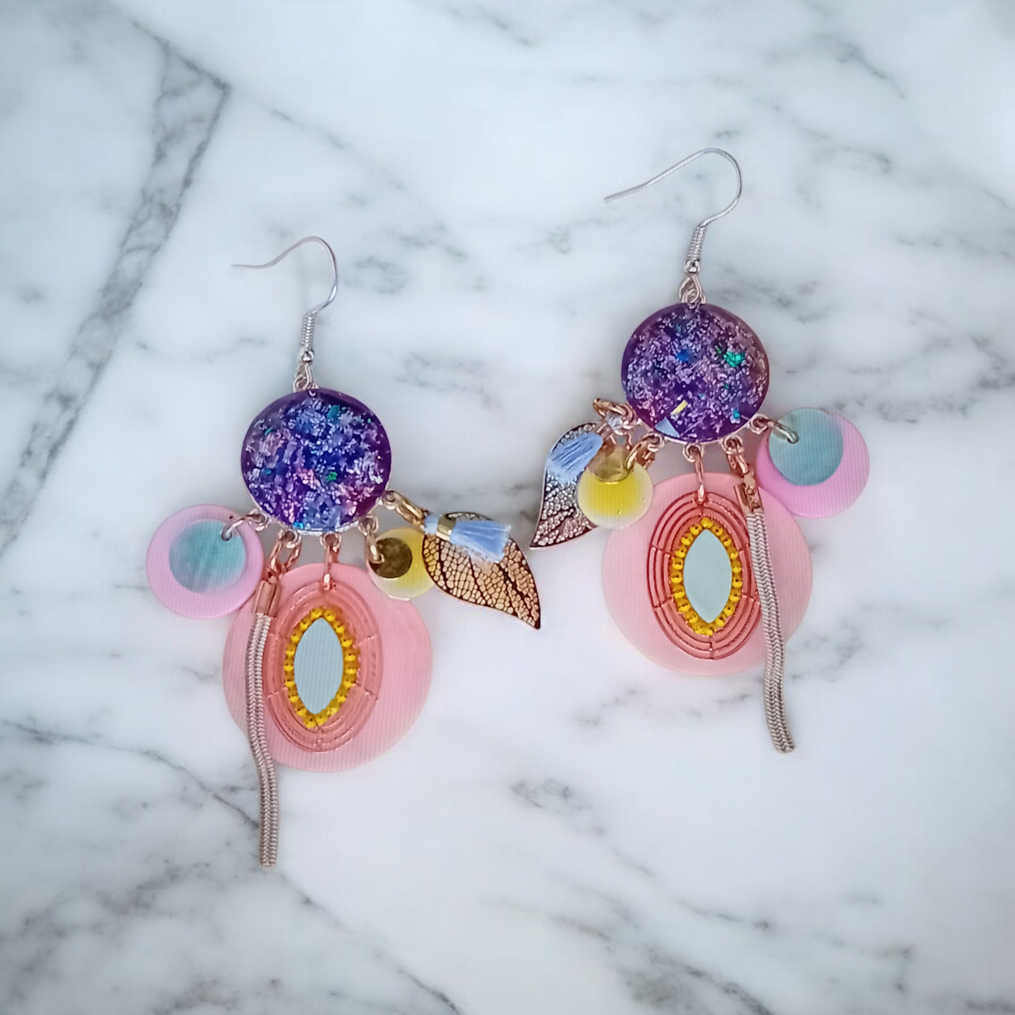 L'estampe principale ronde rose, ajoute une touche de délicatesse avec son dégradé de couleurs rose, jaune et argenté. Les estampes de formes et de tailles différentes, dans les mêmes tons, apportent une dimension unique à ces boucles d'oreilles.