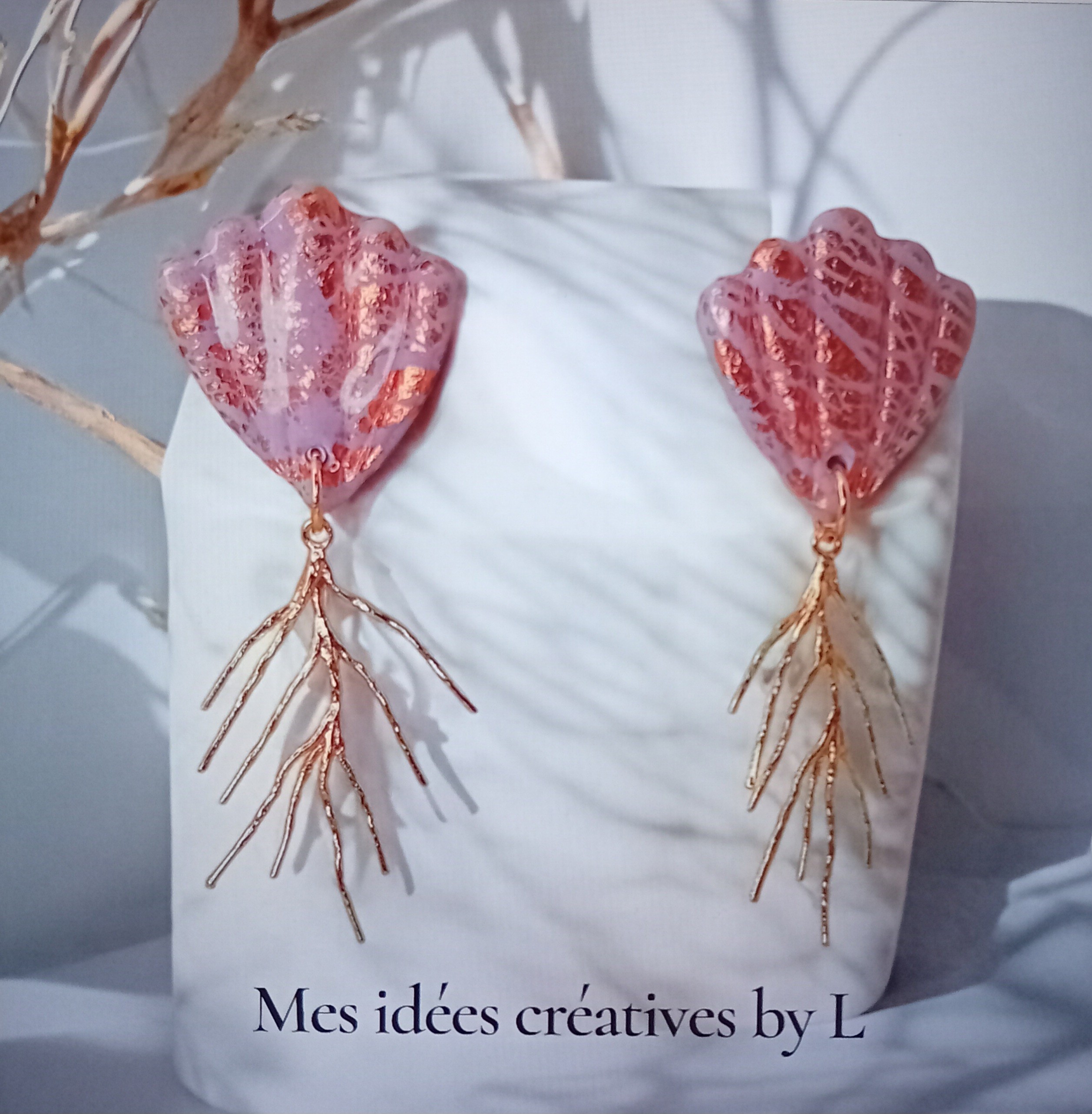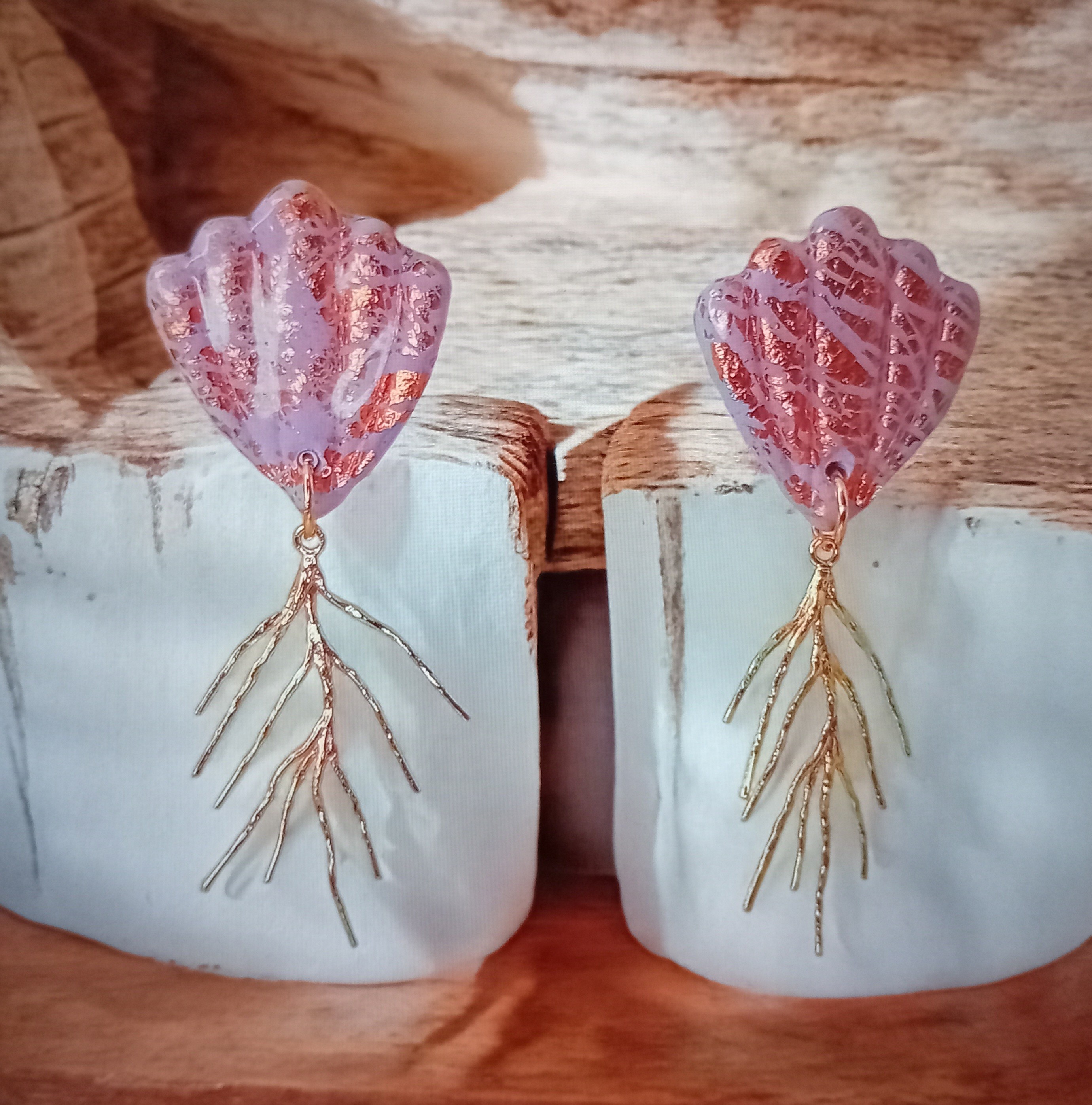 Le coquillage en pâte polymère, délicatement recouvert d'une couche de résine transparente, brille comme une perle rare, tandis que le pendentif doré en forme de corail ajoute une touche d'élégance et un raffinement.
