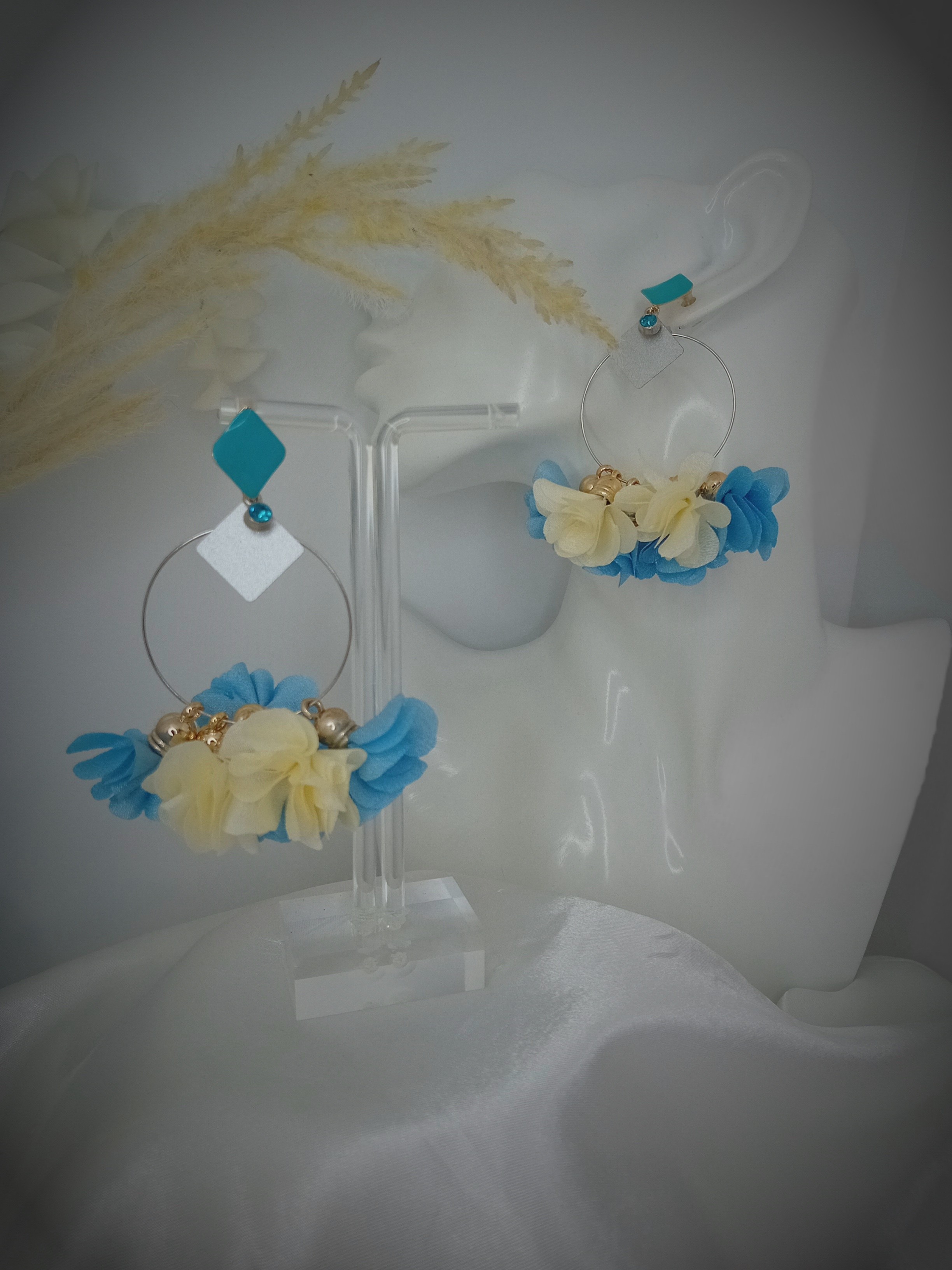 Les apprêts émaillés bleu turquoise, offrent une touche de couleur vive et rafraîchissante. Les boucles Ava sont composées de plusieurs fleurs en tissu, mêlant harmonieusement des fleurs couleur turquoise et des fleurs couleur écru. Ces fleurs apportent un peu de douceur et de féminité à l'ensemble.