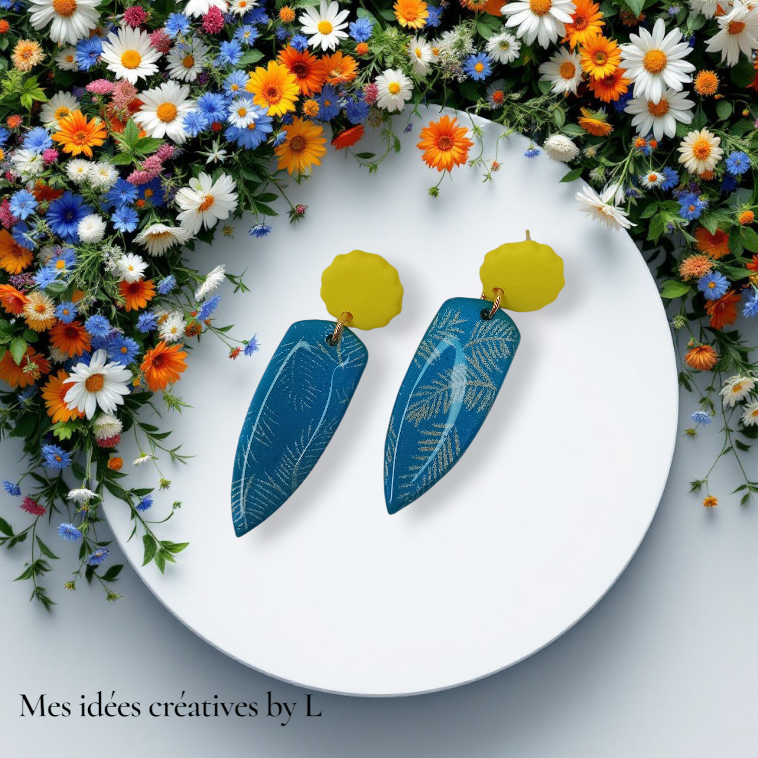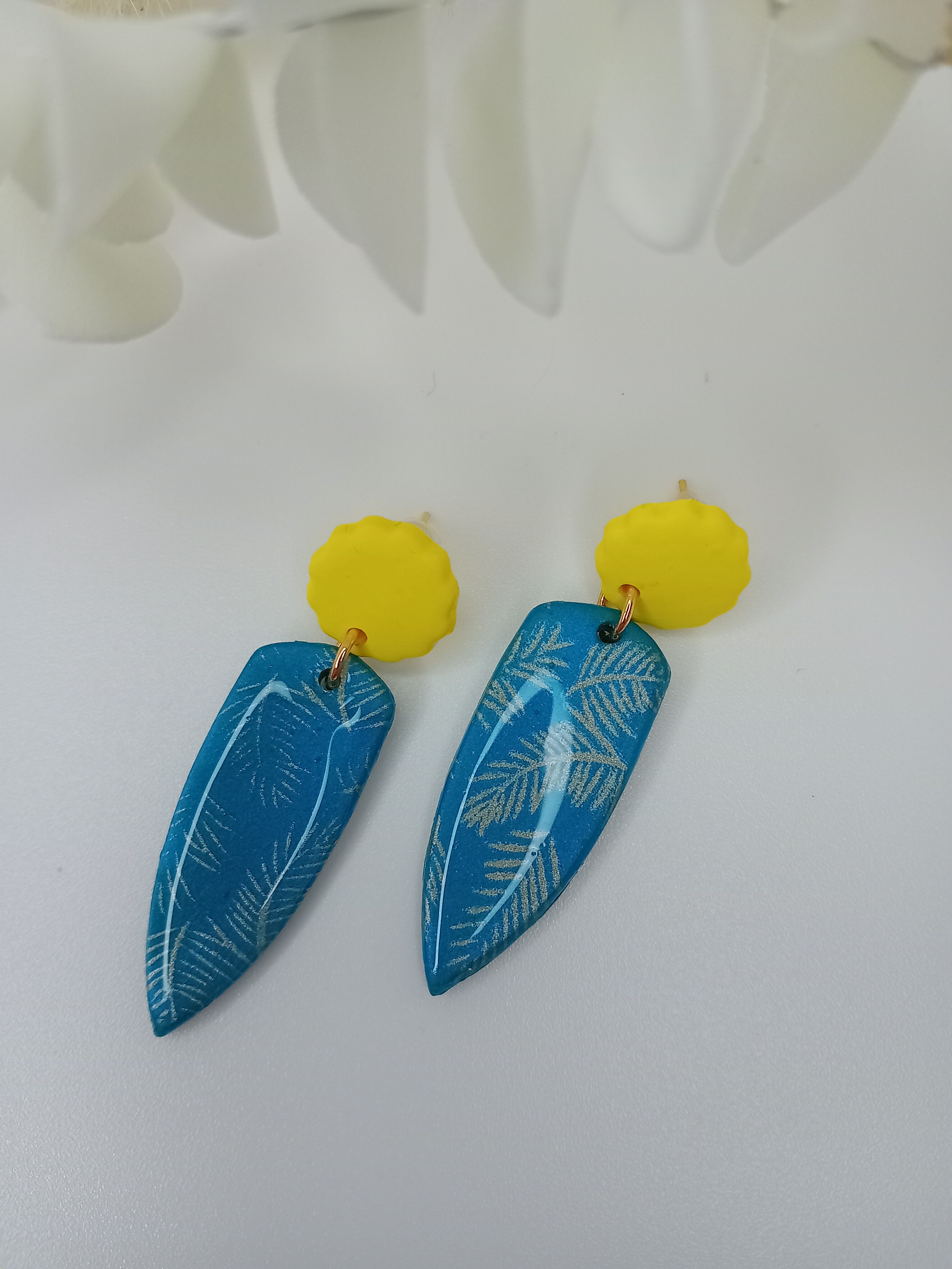 Matière en pâte polymère couleur jaune ensoleillement et couleur bleu paon, motif feuilles champagne doré.