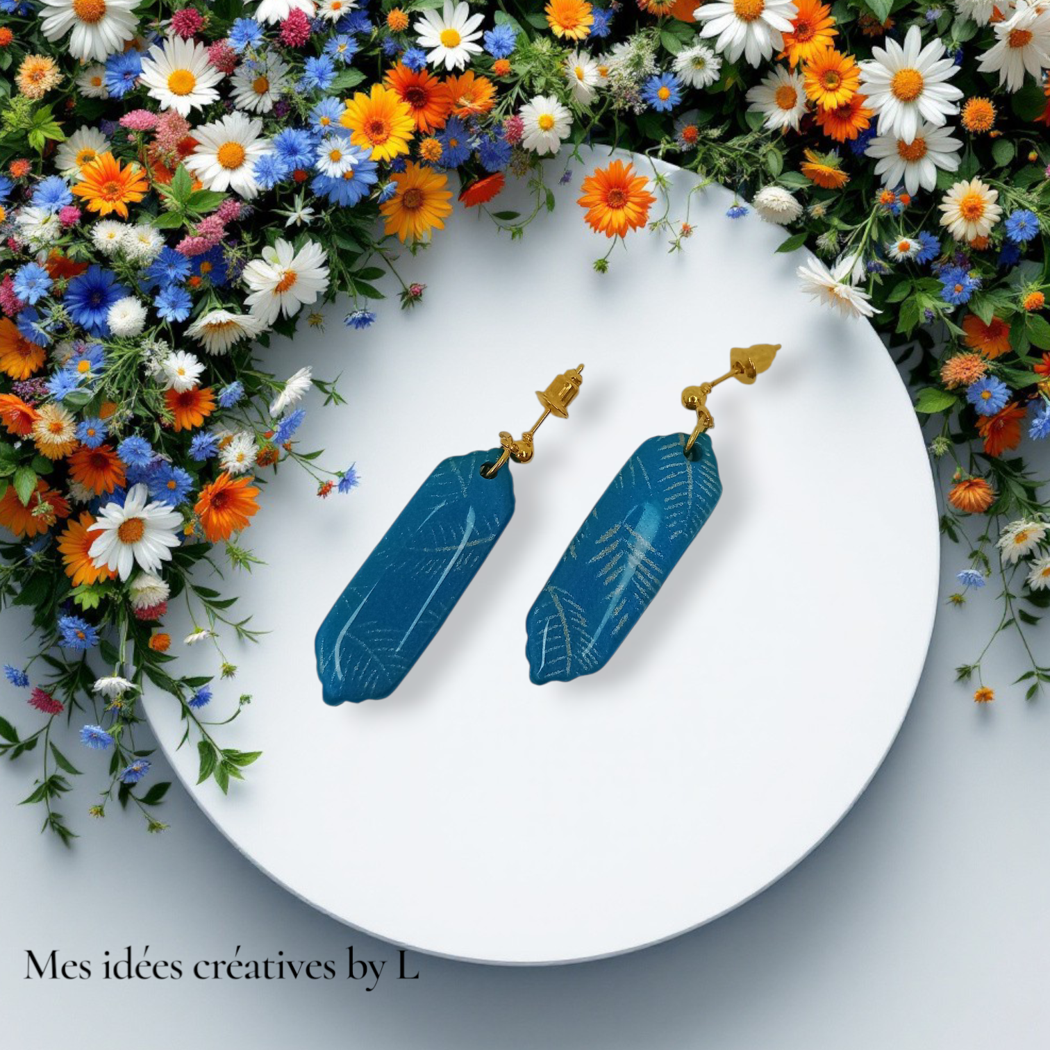 ✨ Faites sensation avec ces jolies boucles d'oreilles en pâte polymère couleur bleu paon, accompagnées de feuilles champagne doré qui apportent raffinement et glamour à votre style. Vous pourrez les portées en journée, ou pour une soirée entre amis par exemple. Elles ne manqueront pas de vous faire rayonner.