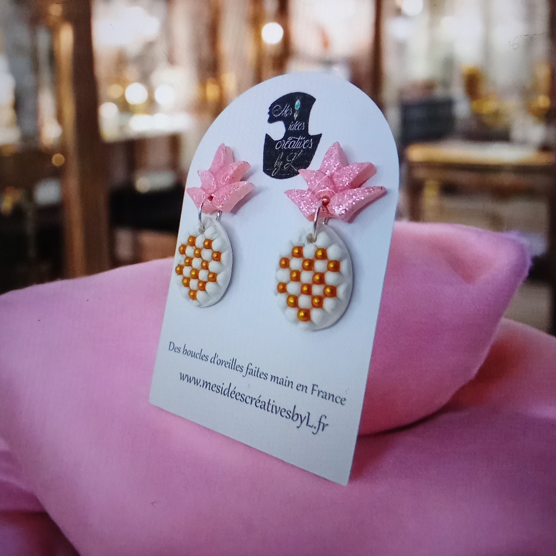 Les boucles d'oreilles Pineapple sont conçues en pâte polymère blanche pour le bas de l'ananas, agrémenté de petites perles dorées incrustées dans la pâte. Le feuillage de l'ananas est d'un rose pailleté pour apporter une touche de couleur et de brillance à votre look estival ☀️