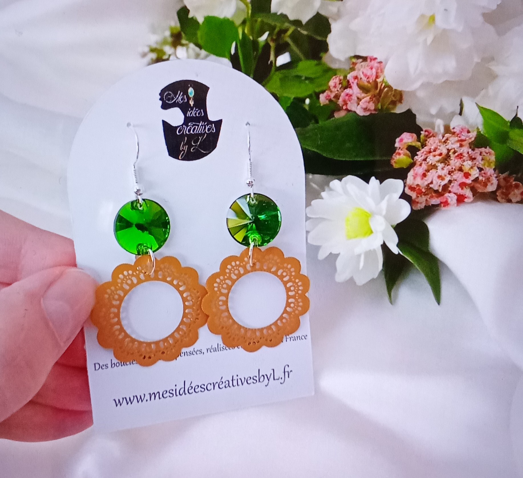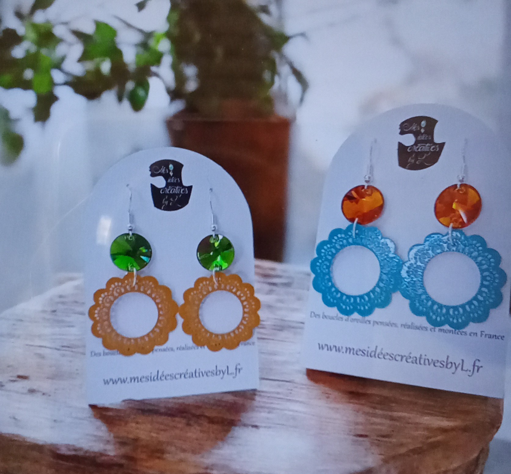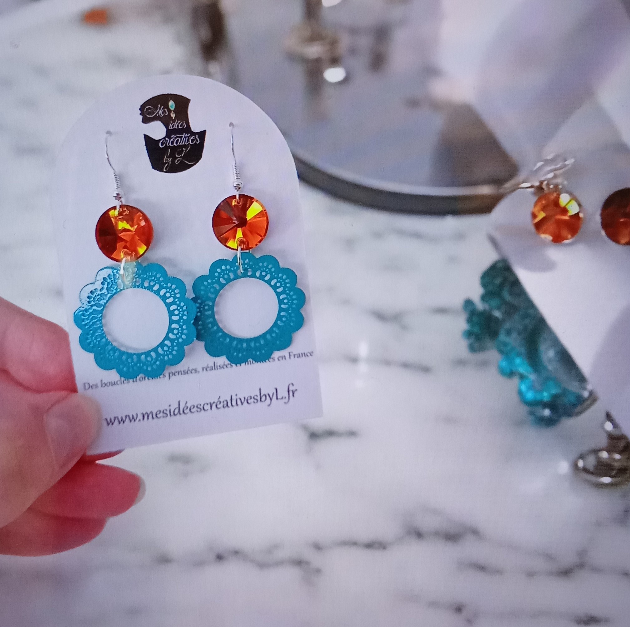 MATÉRIAUX : pendentif en métal coloré, cristal rond, les apprêts sont en crochets et en acier inoxydable.