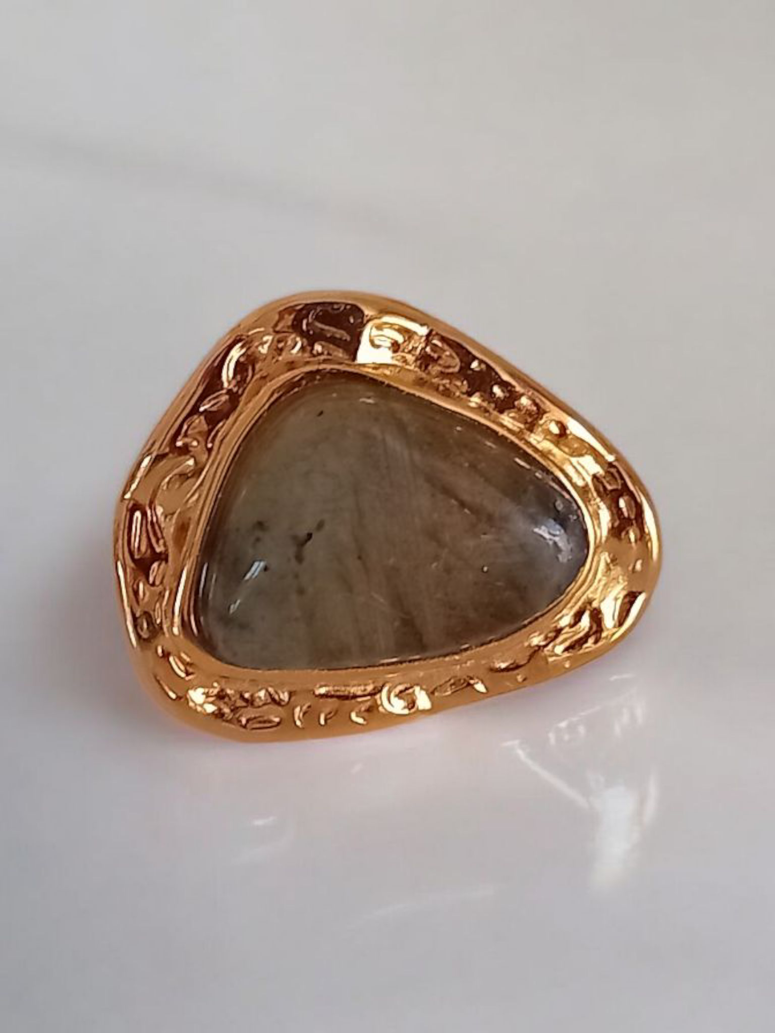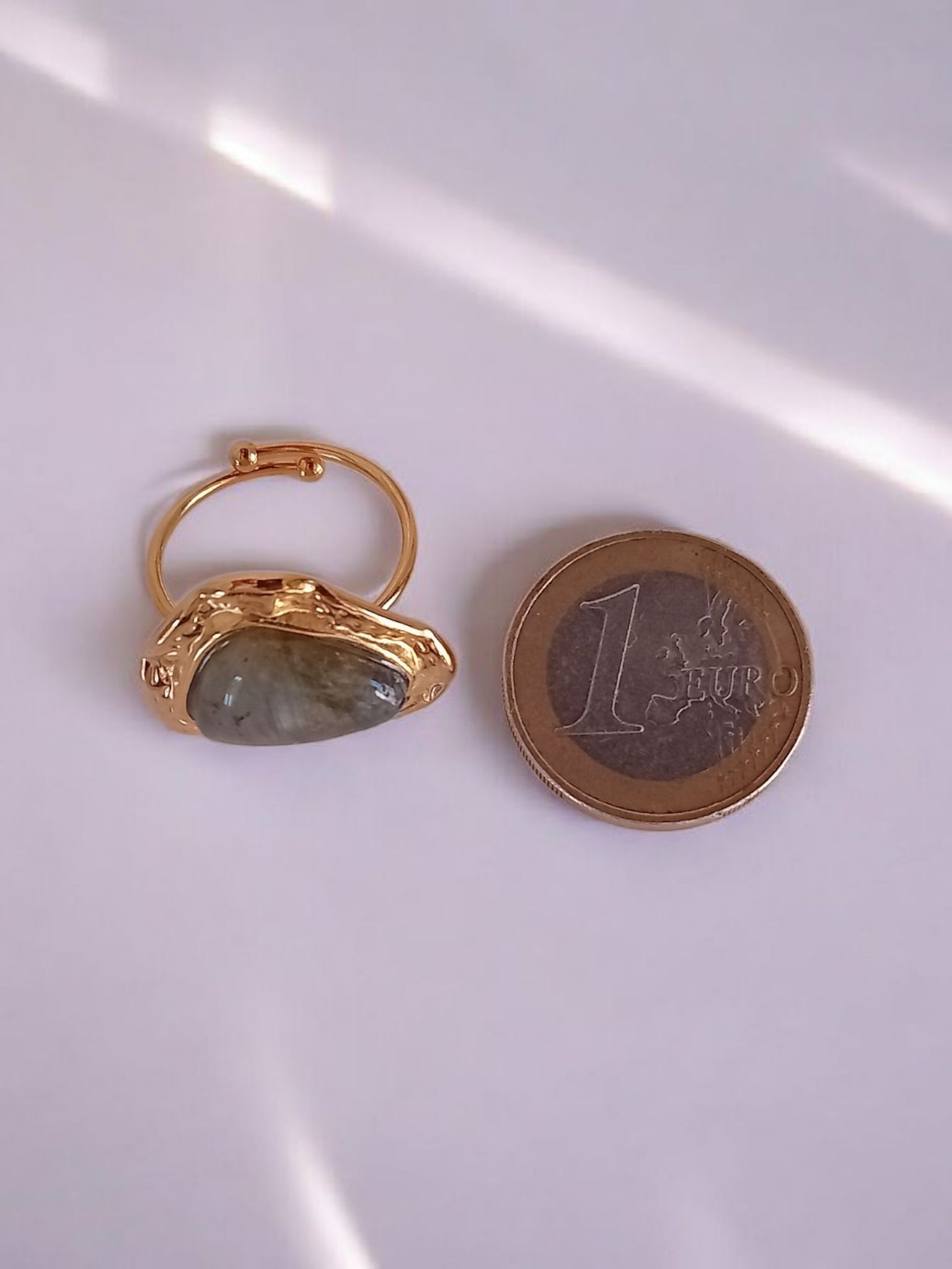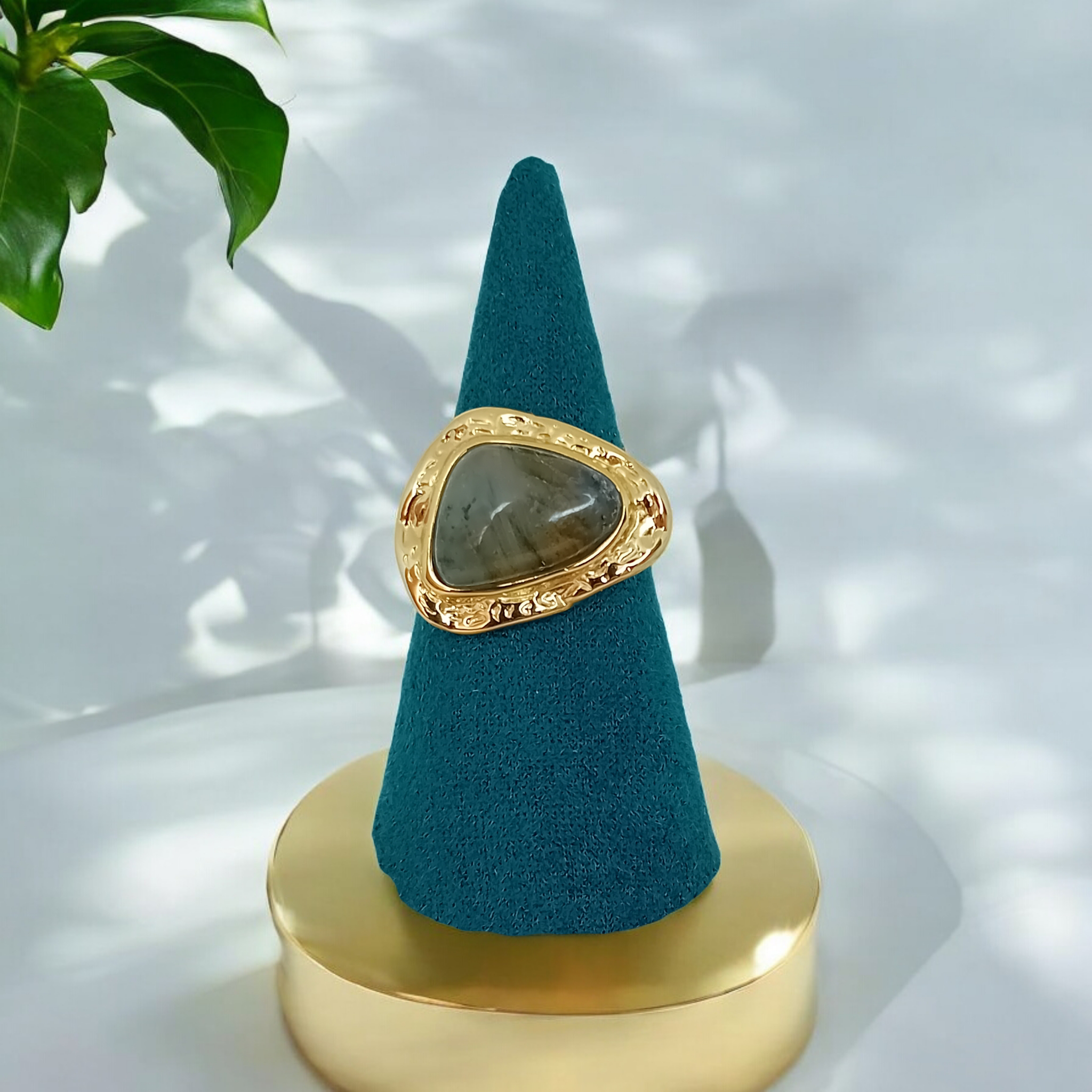 ✨ Sculptée dans une forme organique, la bague Organa capture l'élégance brute de la nature. Son cabochon foncé, profond et mystérieux, contraste avec un contour doré martelé qui reflète la lumière sous tous les angles.
